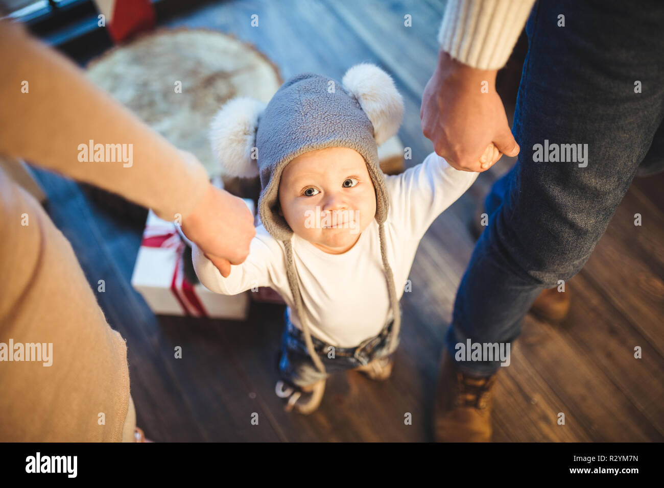 Adorable 1 Year Old Baby Girl Enjoying Christmas At Home Stock